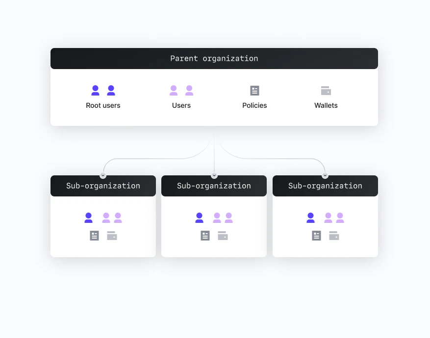 • Both parent organizations and sub-organizations contain a set of resources and authenticators that you can configure, including their own users, wallets, API keys, private keys, and policies.